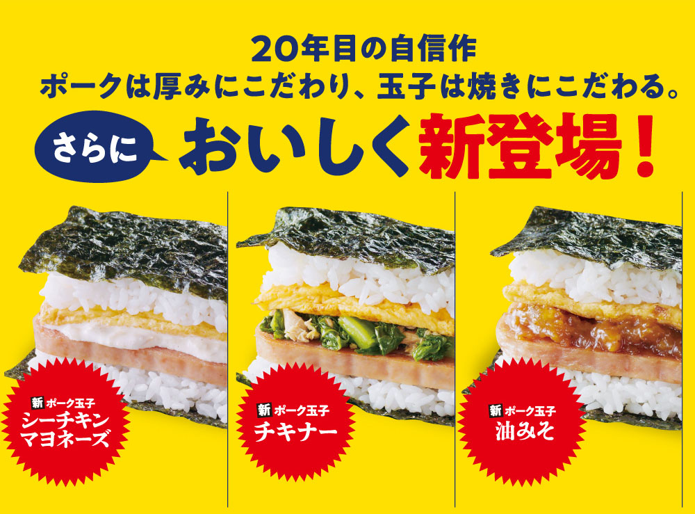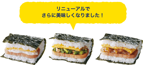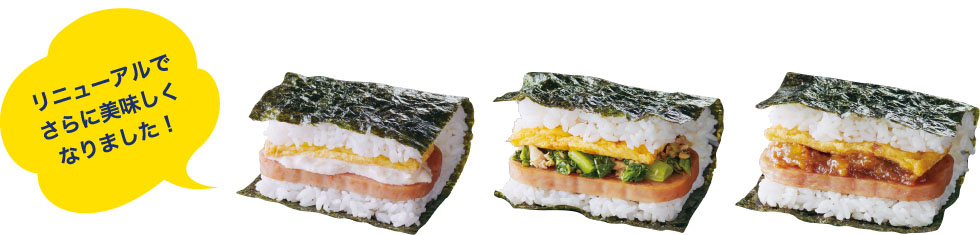 ポーク玉子は間にトッピングしてあるシーチキンマヨネーズの配合を見直しました。よりツナの旨味とマヨネーズのコクがアップ。ポークと玉子の間からシーチキンマヨネーズがバランスよく感じられます。