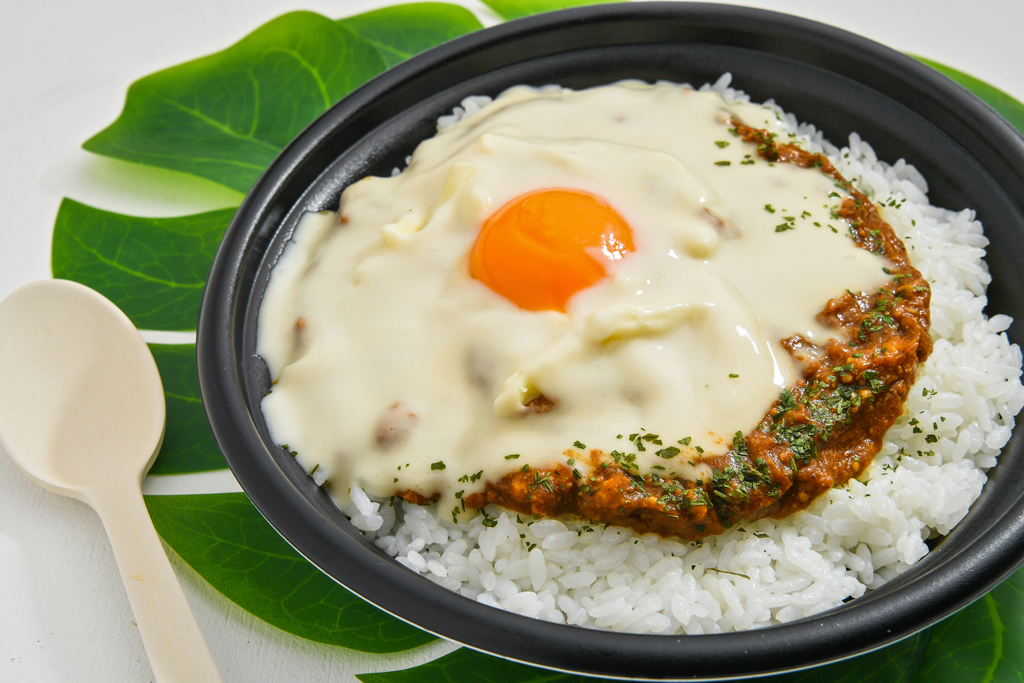 キーマカレーを覆うように盛りつけたホワイトソースが目を引くお弁当。温めることでとろーりとしたホワイトソースをスパイスの効いたカレーと絡めてお召し上がりください。