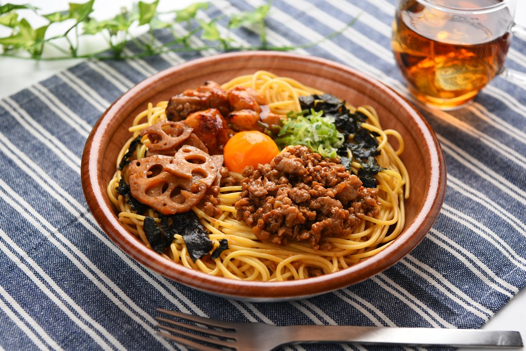 醤油だしで和えたパスタの上に、焼鳥と甘辛く味つけした鶏そぼろとお月見をイメージした卵黄ソース、蓮根のきんぴらや青ネギをトッピングした和風パスタです。
