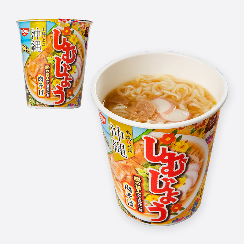 沖縄そばの名店「しむじょう」監修。鰹だしに豚の旨味を利かせた和風スープと食感の良い幅広ノンフライ麺が特徴のカップ麺です。