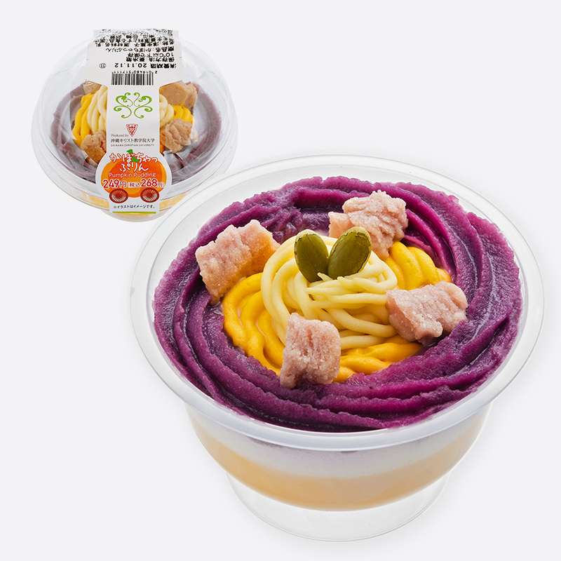 「学P総集編」2011年度、キリスト教学院大学考案。かぼちゃプリンの中にアクセントになるアップルダイスとアーモンドを入れ、ホイップクリーム、紅芋クリーム、パンプキンクリーム、さつま芋クリームを絞り、色鮮やかに仕上げました。