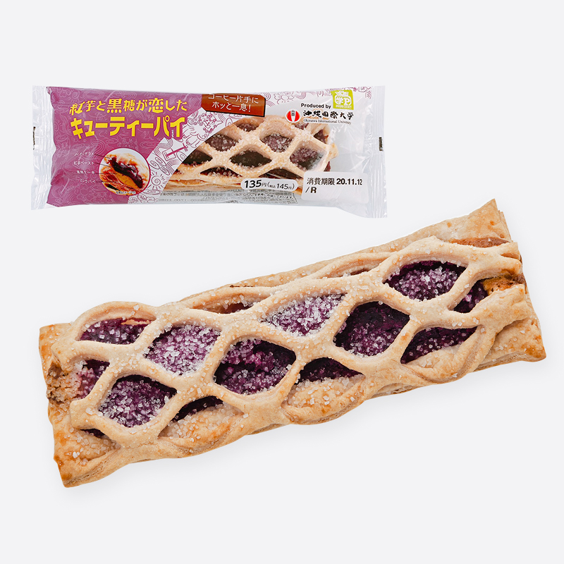 「学P総集編」2019年度、沖縄国際大学考案商品。沖縄素材の紅芋と黒糖の組み合わせ。パイ生地に黒糖ケーキと紅芋ペーストをしぼりザラメをトッピングしました。コーヒーのおともにオススメです。