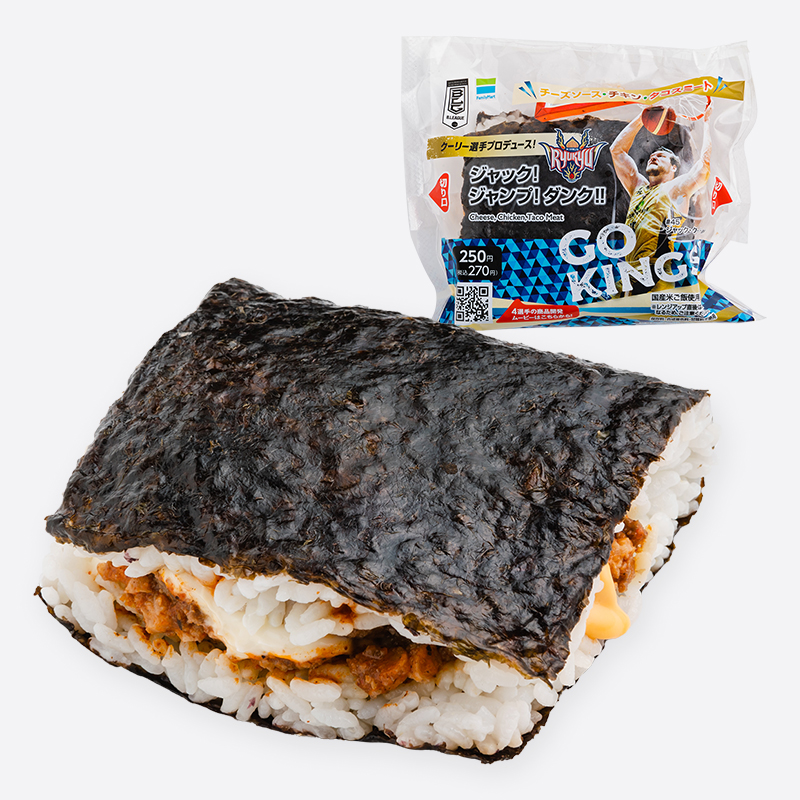 グリルチキンにクーリー選手の好きなタコスミートとチーズソースを贅沢にトッピング。出身地イリノイ州のソウルフード「シカゴピザ」をイメージしたサンドおむすびです。