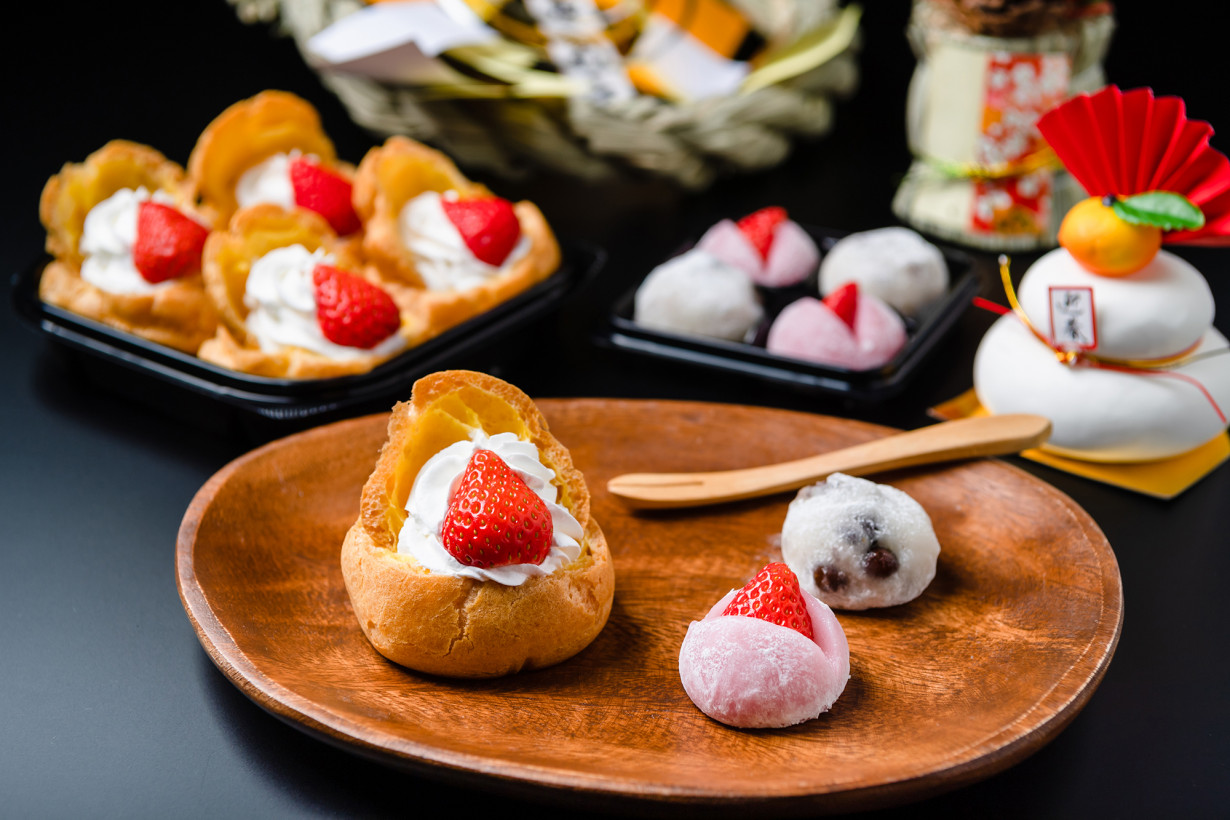 今回のおすすめは、北海道産生クリームをブレンドしたホイップとカスタードのダブルクリームを絞り、フレッシュ苺を使用した贅沢ないちごのシュークリーム4個入りと、いちごを乗せたレアチーズ大福と塩豆大福の2種類の味が楽しめる紅白大福!