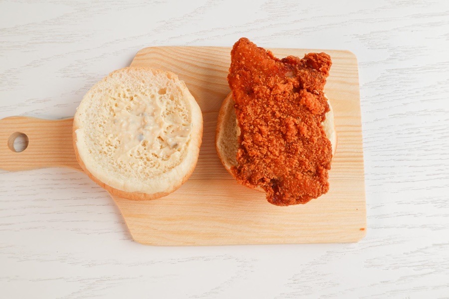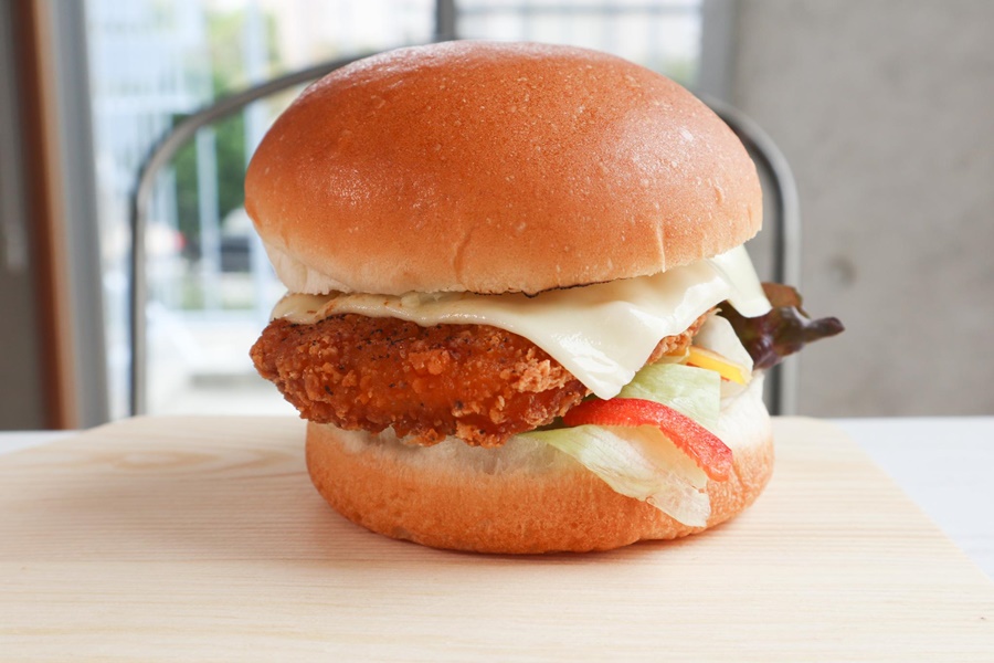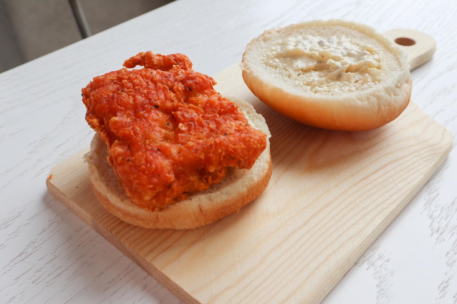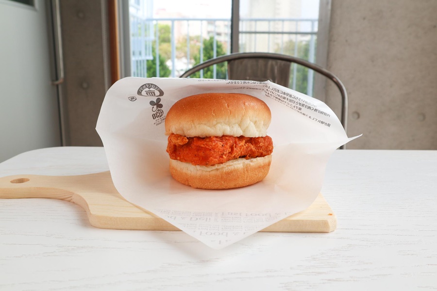 いいですね!!スパイシーチキンが結構はみ出しているけど、食べている途中に崩壊しないラインを守っているように見えます。そしてタルタル、スパイシーチキンの勢いにムギュッと押し出されていますが、バンズ内に綺麗に収まっているので手が汚れる心配はなさそう。