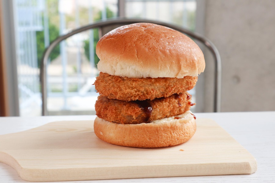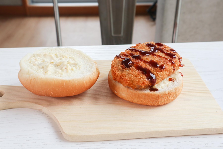 コロッケも合うのではないでしょうか。上間フィッシュバーガーと同じく、コロッケも2個挟んでみましょう。