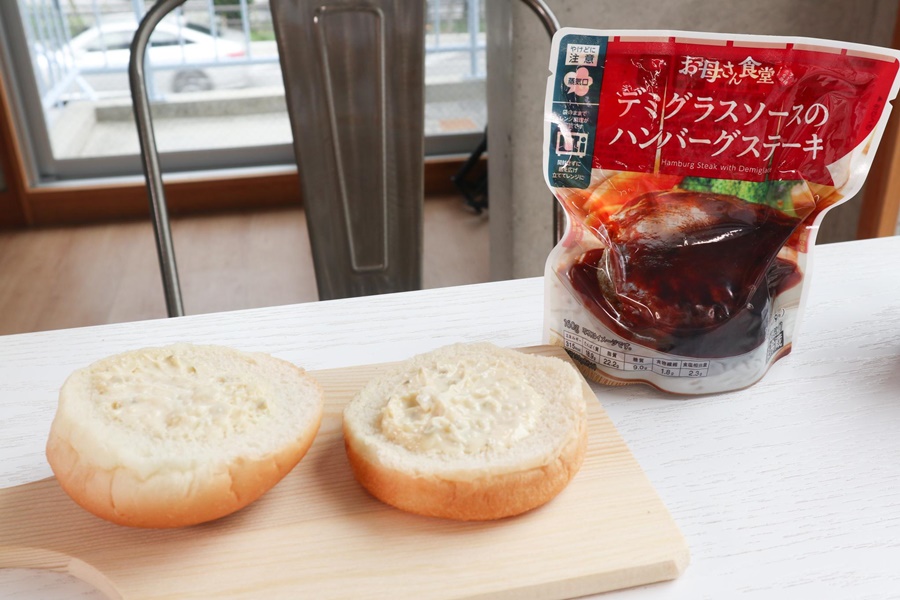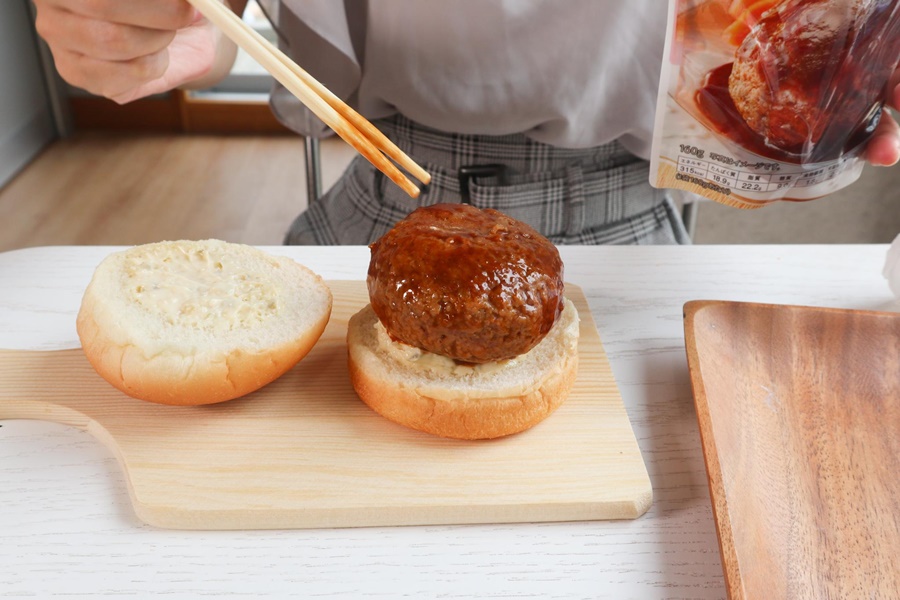 どうしてもやってみたかったのが、お母さん食堂の「デミグラスソースのハンバーグステーキ」。ハンバーガーといえばハンバーグ!という方は絶対に気になっていたはず。早速ハンバーグをレンジでチンし、のせてみます。