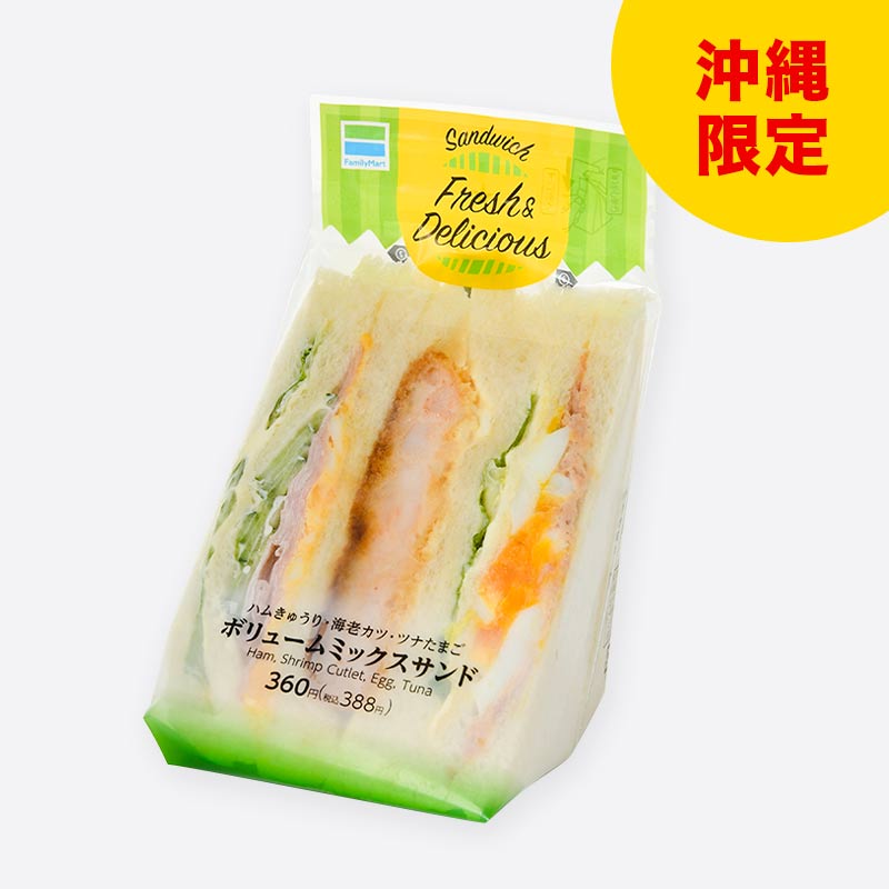 2021.03.09 ボリュームミックスサンド ファミマ新商品 シェア Tweet ハム・レタス・たまごのサンド、海老カツサンド、ツナサラダ・ゆで玉子のサンドを組み合わせた3つの味が楽しめるボリュームサンドです。 価格388円(税込) 発売日2021年3月9日 一部店舗にて取扱いのない場合がございます。 掲載の新商品は今後、パッケージ・規格・価格の変更及び販売終了となる場合がございます。
