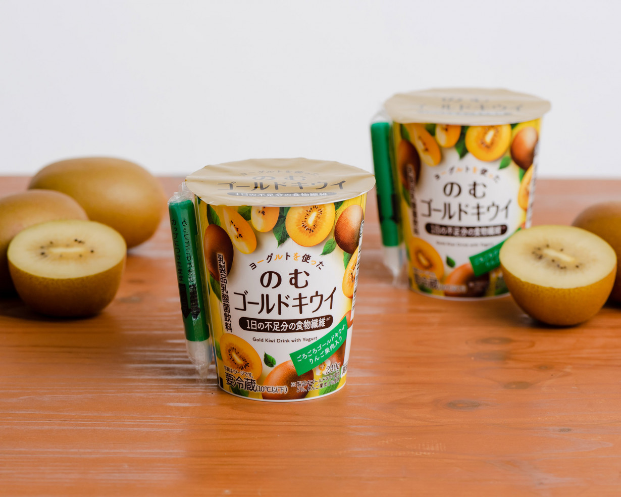 ゴールドキウイ果肉を使った、おいしく1日の不足分の食物繊維(4g)を補える飲むヨーグルトです。