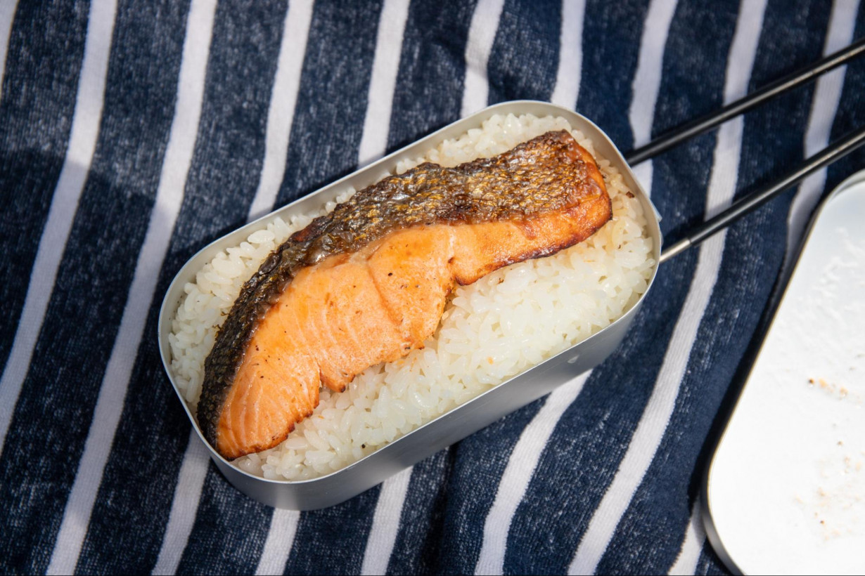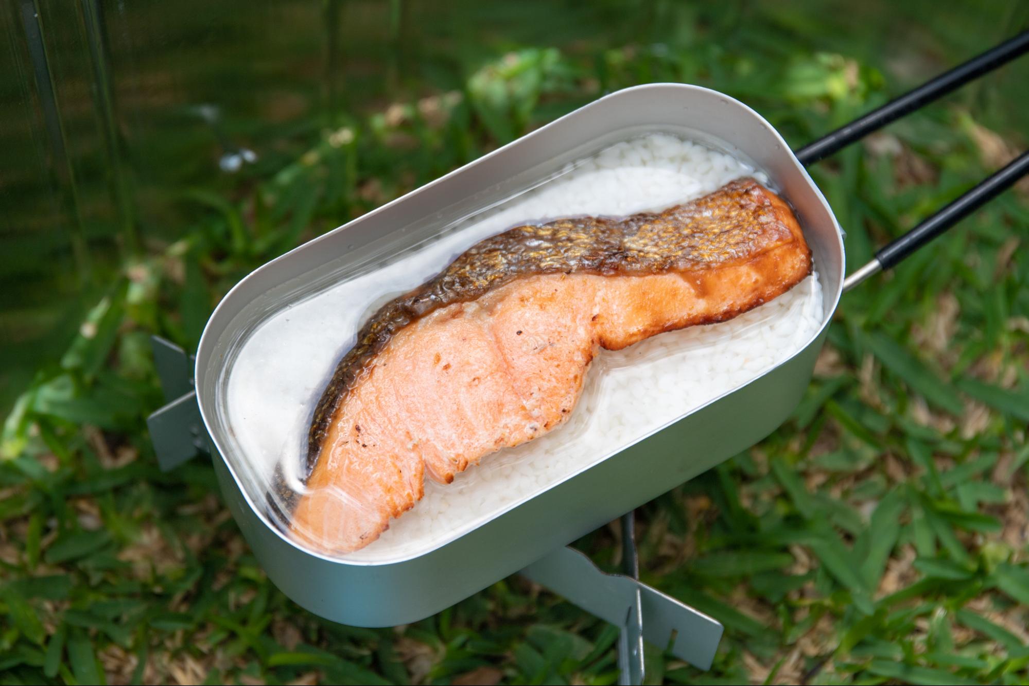 まず先ほどボロボロジューシーにも使用したメスティン(アルミ製の箱型の飯ごう)にお米と水を入れ、その上にお母さん食堂の「銀鮭の塩焼き」をのせます。それだけ。