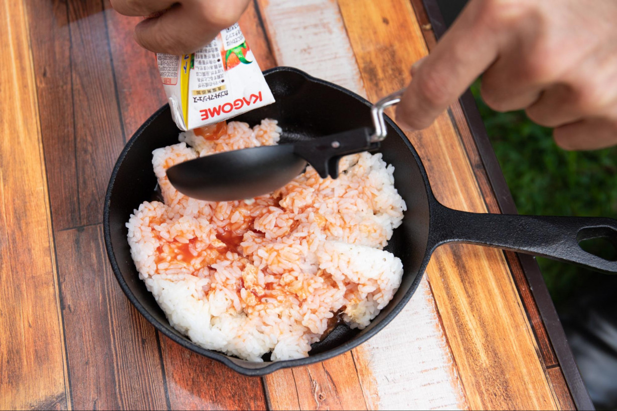まずおむすび2個をフライパンに入れ、トマトジュースを1パック入れます。