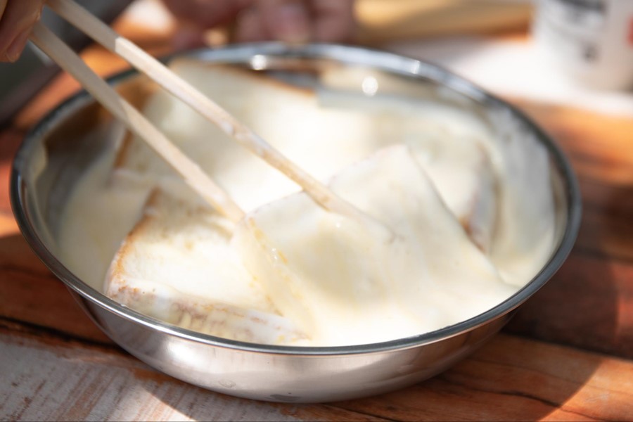 【材料】食パン、卵(1個)、砂糖(大さじ1~2)、食べる牧場ミルク(アイス)1パック