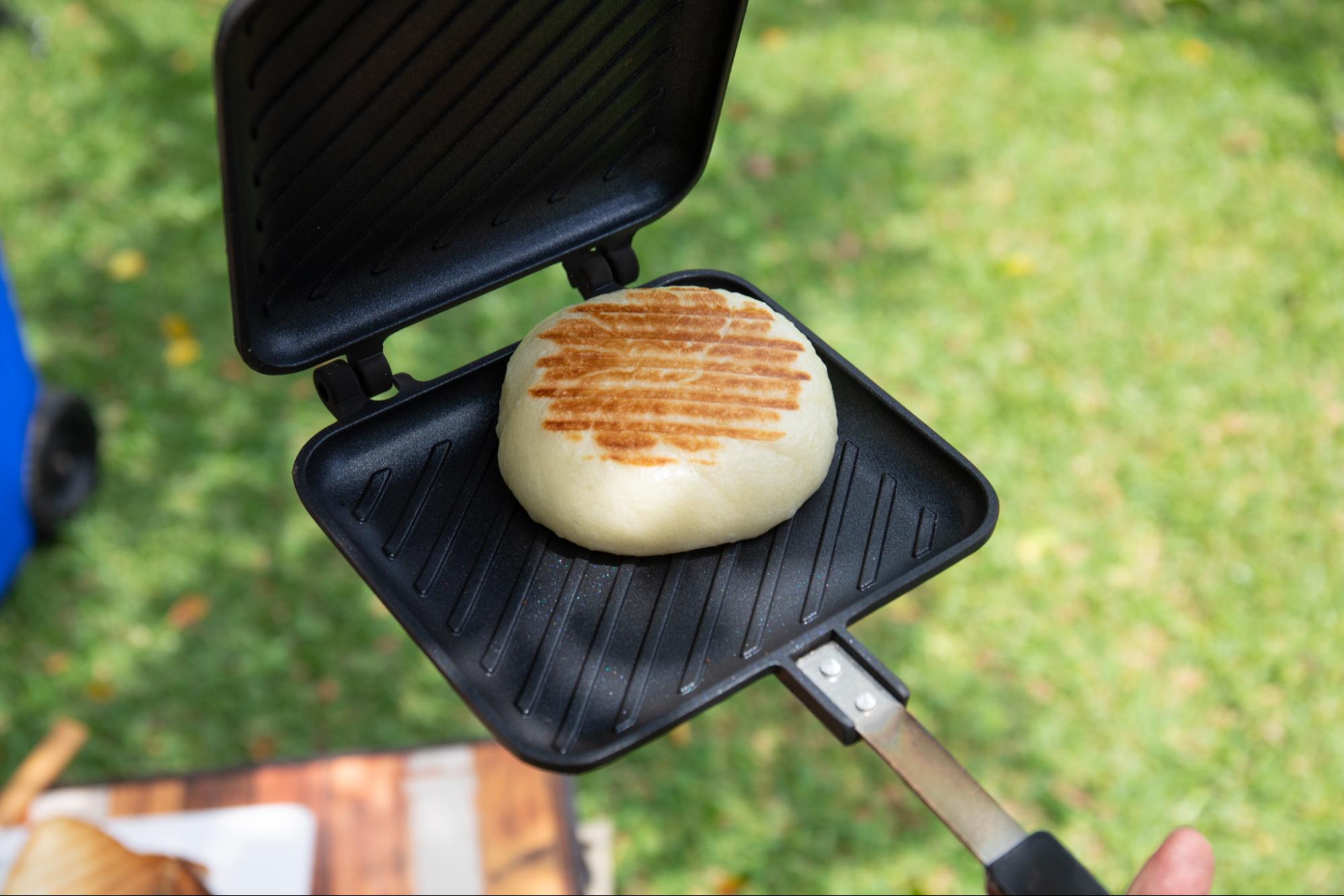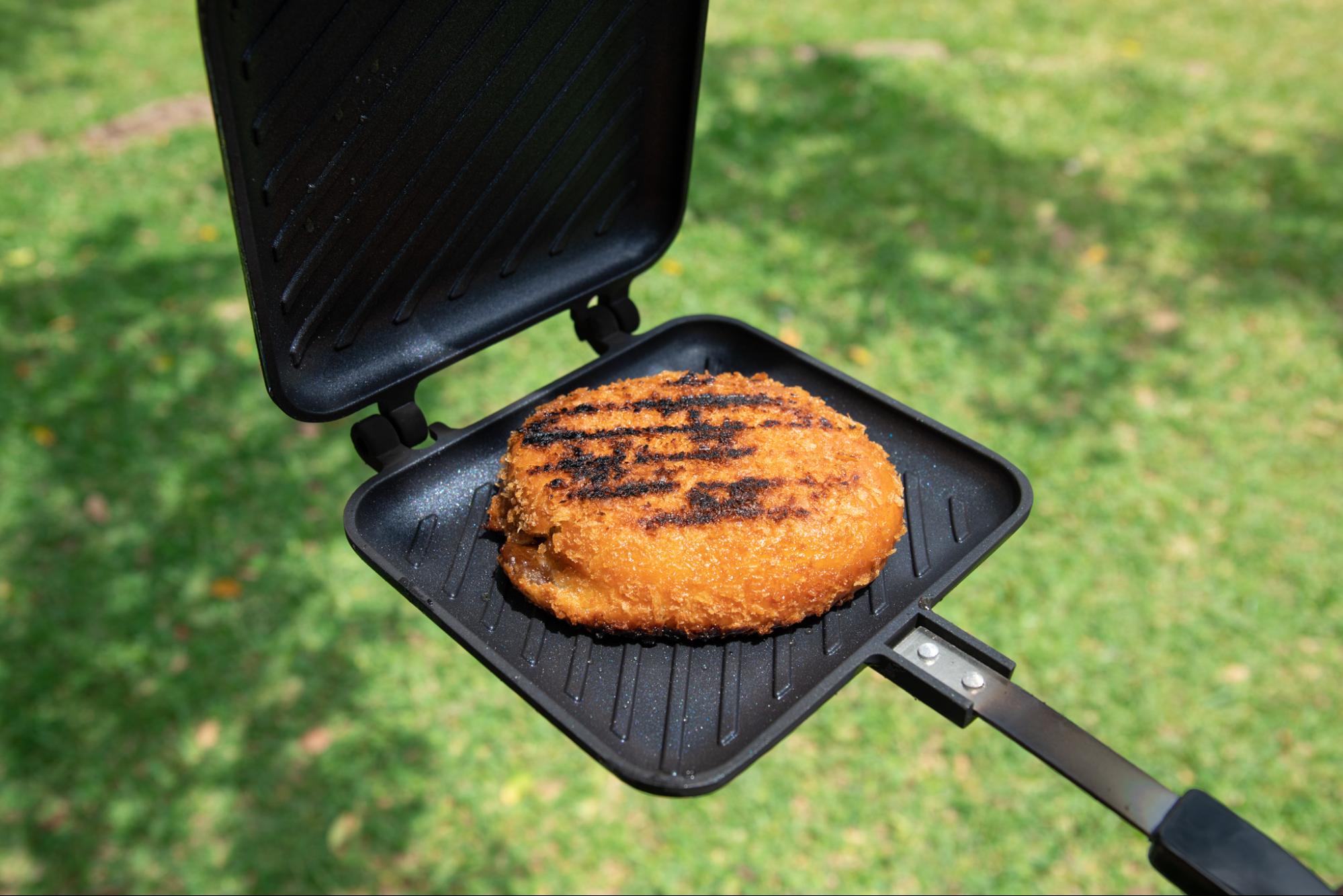 さて、いい具合に焼けてきたら、ホットサンドクッカーをひらく瞬間のわくわく感を大切に、少しずつひらいていきます。
