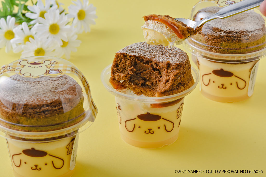 サンリオ人気キャラクター「ポムポムプリン」コラボスイーツ。カスタードプリンの上にカラメルソースを絞りキャラメルスフレをのせたポムポムプリンをイメージした限定スフレ・プリンです。