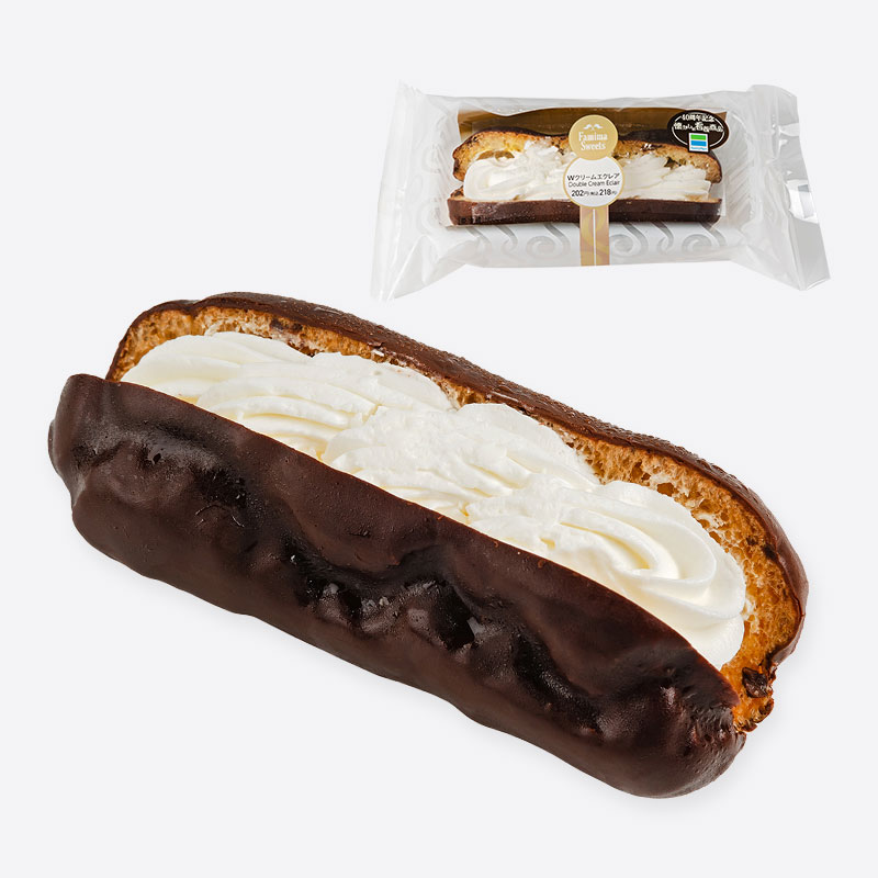 【40周年記念懐かしの看板商品復活祭対象商品】ファミリーマートで過去に大ヒットしたエクレアを復活。カスタードクリームとホイップクリームを絞ったダブルクリームのエクレアです。