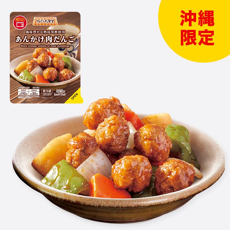 沖縄の食卓によく出てくる人気メニューがいつでも手軽に味わえる「ファミンチュ食堂」。中華肉団子に風味豊かな熟成黒豚を使用しました。