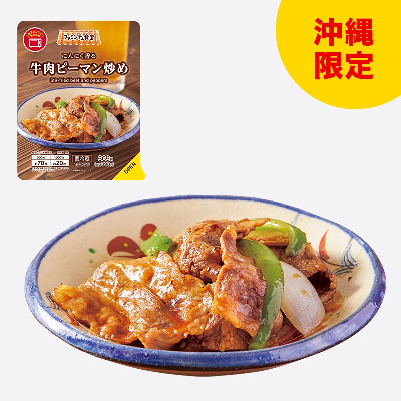 沖縄の食卓によく出てくる人気メニューがいつでも手軽に味わえる「ファミンチュ食堂」。家庭の味を再現するためオリジナルたれを使用。にんにくが食欲をそそります。