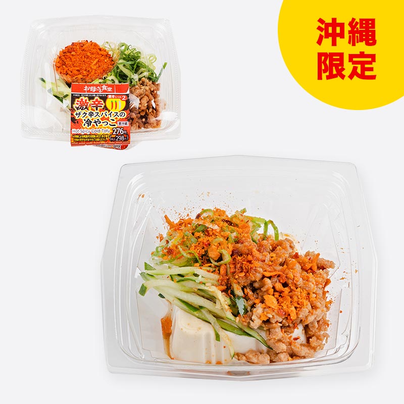 【激辛フェア対象商品】ラー油入り醤油だれとザクザクスパイスをかけた冷やっこ。大豆ミートのそぼろを使用しています。