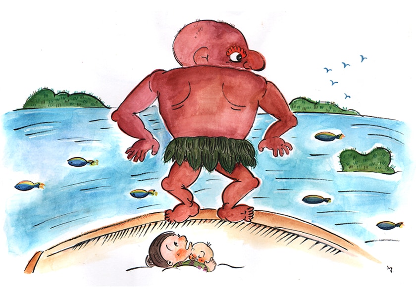 息をひそめてサバニの下に隠れるウター。アヒーは遠く海を眺めながら、「アイヤー!せっかくのご馳走を食い損ねたっ!」と文句を言いながら帰って行きます。