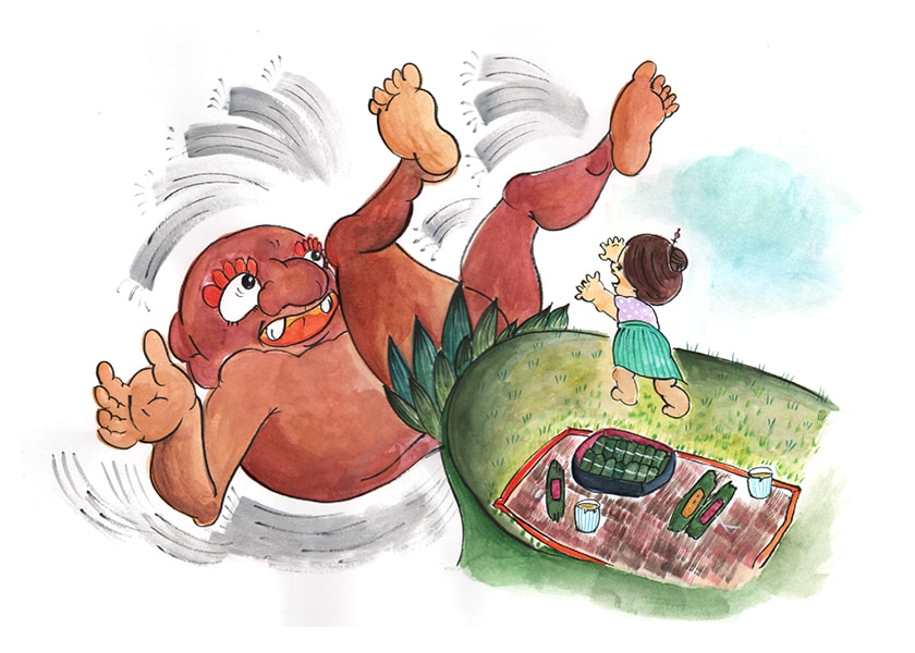 寂しくて寂しくて、生きる気力を失ったアヒーは近所のお家から牛や豚をさらい、食べ始めます。繰り返すうちに少しずつ、ひとつ、またひとつとマブイ(魂)をマジムン(鬼)に奪われてしまいました。