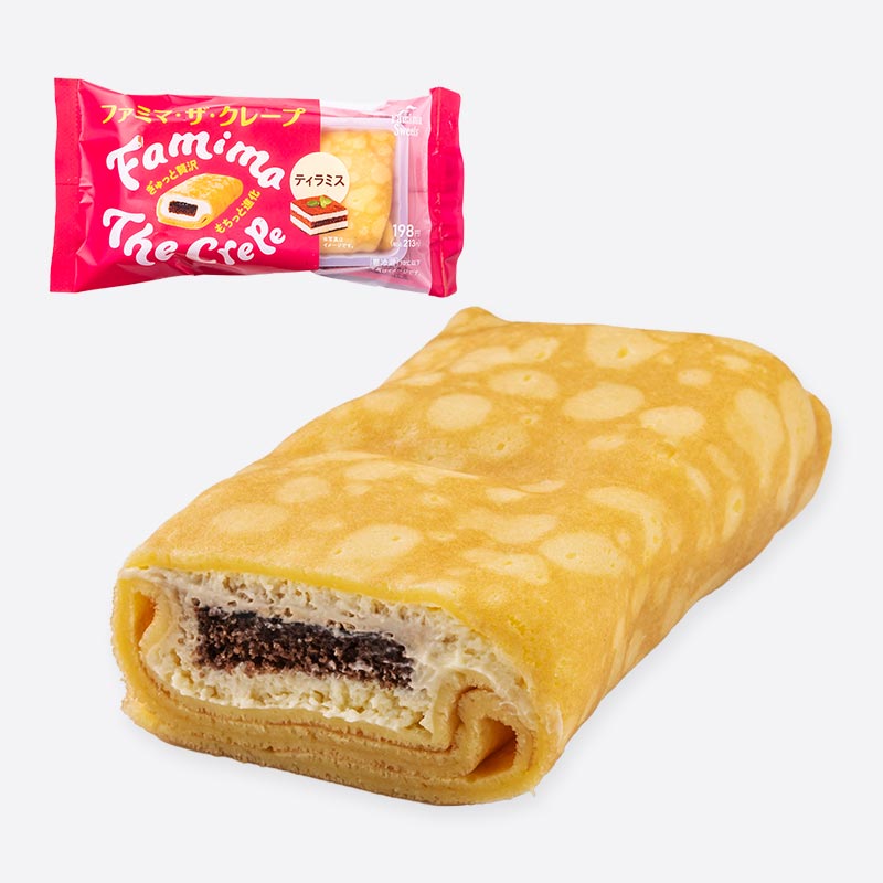 絶妙もちもち食感のファミマ・ザ・クレープティラミスです。北海道産マスカルポーネ、北海道産生クリーム入りホイップ、コーヒーシロップを染み込ませたココアスポンジ、コーヒーソースを包みました。