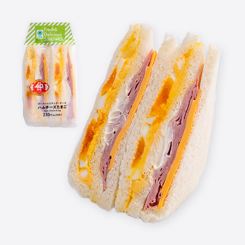 「40%増量作戦」対象商品。ポークハム、チェダーチーズ、コクの味わえるたまごサラダとゆで卵をサンドしました。