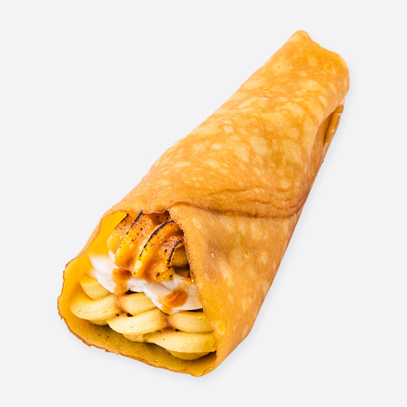 2種類のクリーム(練乳・さつま芋)、自家製スイートポテト、キャラメルソースを包んだもちもち食感のクレープです。