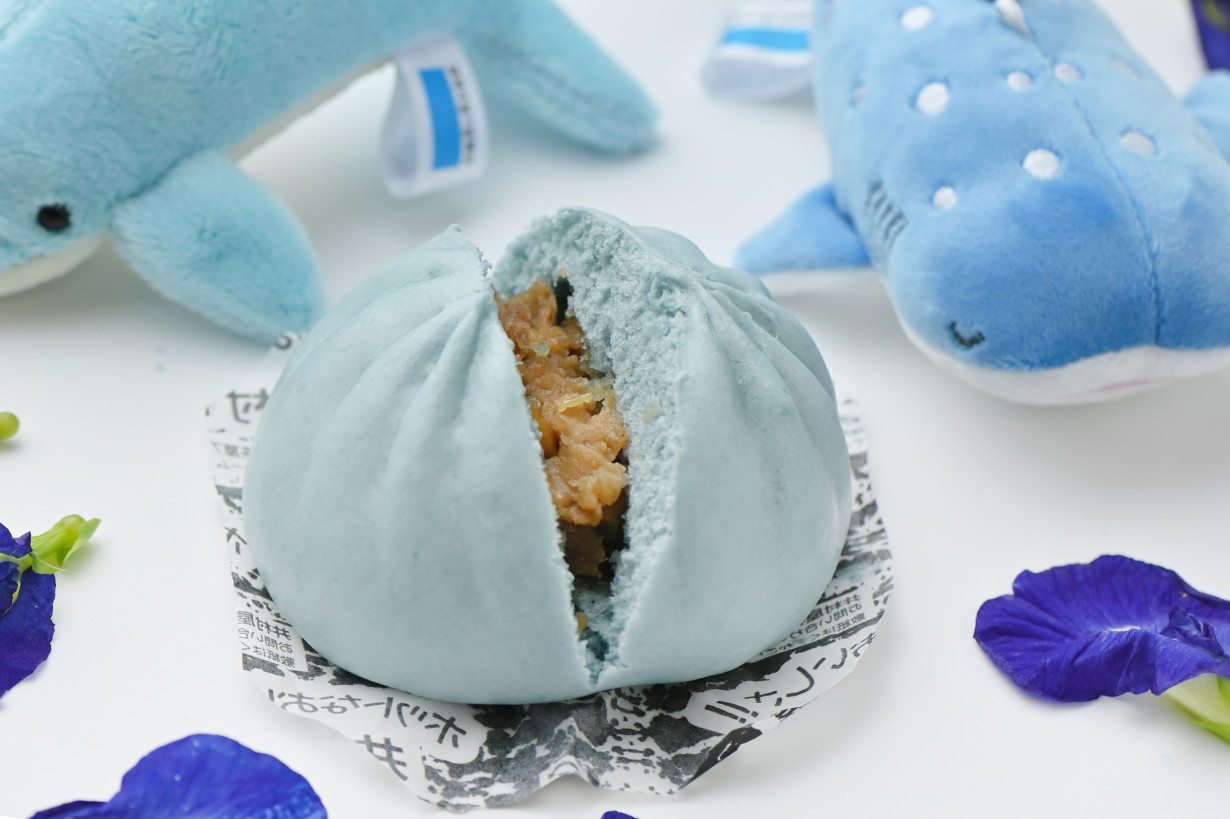 また、「ちゅらうみまん」もおすすめです。沖縄美ら海水族館20周年記念のコラボ商品。バタフライピーを練りこんだ青い生地と、ホタテ貝柱のだしと豚肉の旨みが特長の肉まんです。