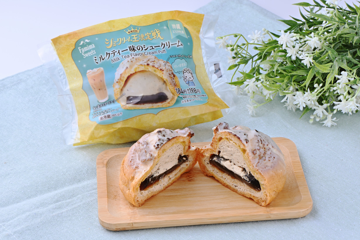 今回のおすすめは、「ミルクティー味のシュークリーム」です。「地域対抗!シュークリーム王決定戦」の沖縄エリア代表商品です。全国各地のストアスタッフが考案した商品を各地域で発売し、総合評価1位となったエリアの商品は全国発売となります。目指せ、全国発売!