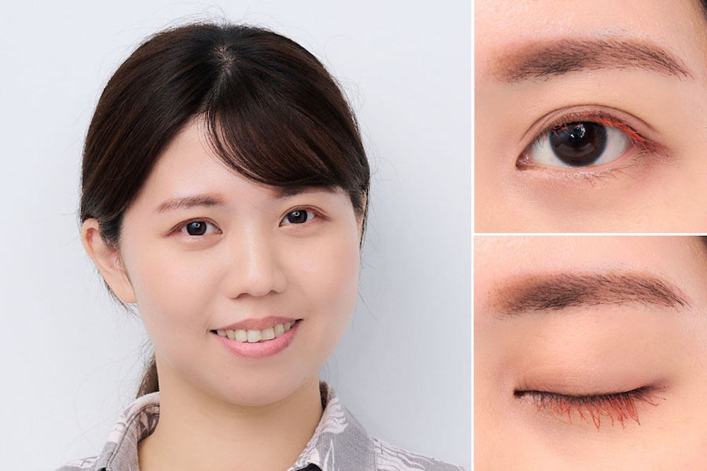 赤系のマスカラを入れるだけで、目元がさりげなく華やいでオシャレに!