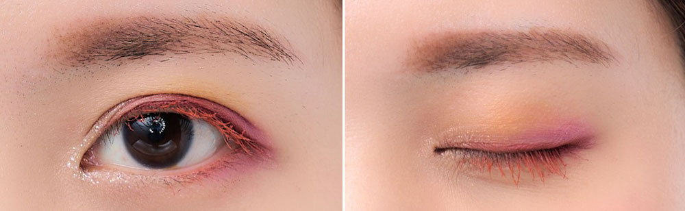 オレンジのシャドウと目頭のラメが加わって、温かくもキラキラした仕上がりに。