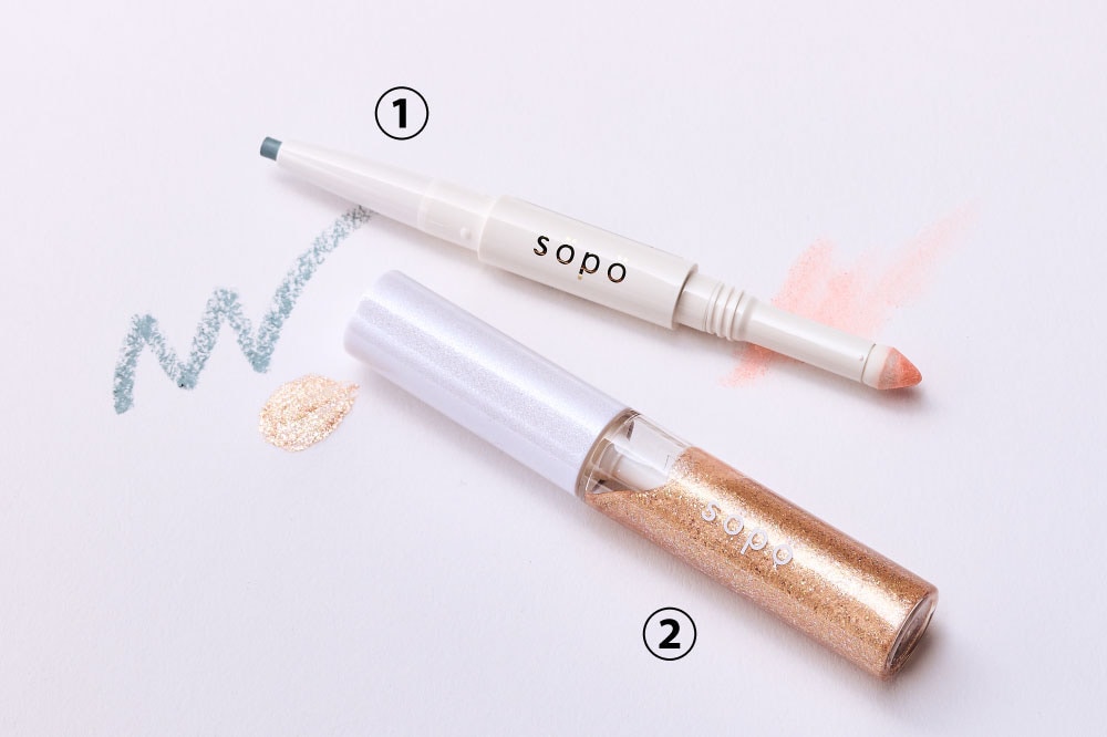 1本でトレンドカラーの目元が作れるパウダー&ライナーと、細かなラメで上品な輝きを放つグリッターを使用します。