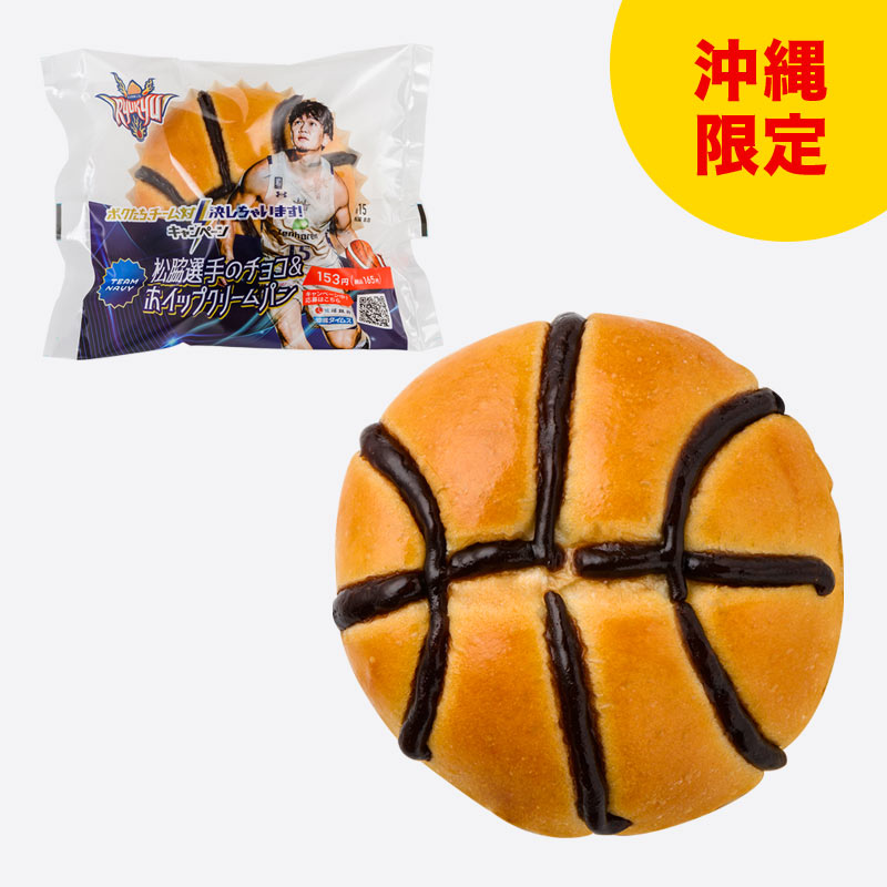 バスケットボールをイメージした生地にチョコフィリングとホイップクリームを入れ、チョコでボールをデザインした手作り感のあるパンです。