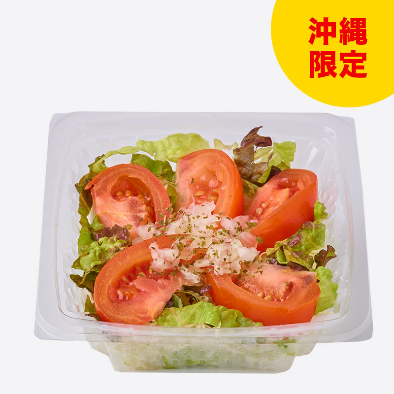 豊見城産「ちゅらとまと」使用。酸味と甘みのバランスが取れた濃い味のトマトを、レタス、玉ねぎと合わせたサラダです。