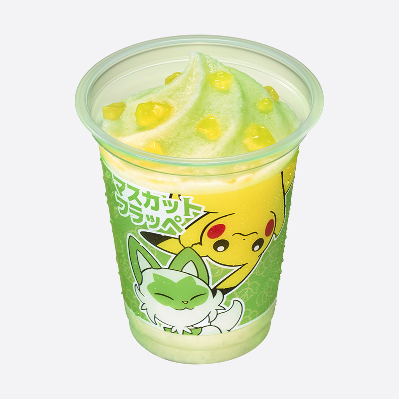 【ポケモンコラボ商品】くさねこポケモン「ニャオハ」をイメージしたマスカットフレーバーのフラッペ。マスカット味のかき氷の中に、「ぷるぷる」とした食感のマスカット味ゼリーが入っています。