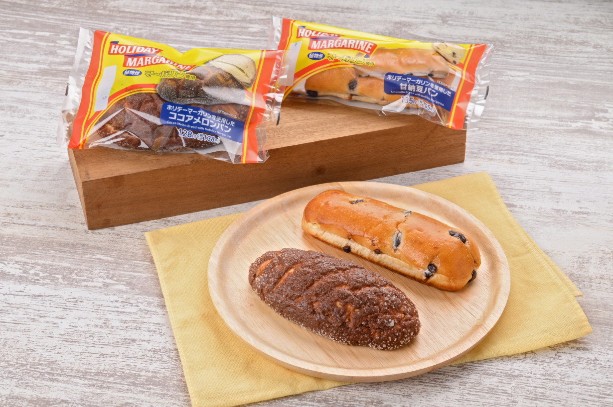 また、ココアパウダー入りのビス生地にザラメをつけて焼きあげたメロンパンにホリデーマーガリンをサンドした「ココアメロンパン」と、甘納豆を生地に練り込んでホリデーマーガリンをサンドした「甘納豆パン」もおすすめです。