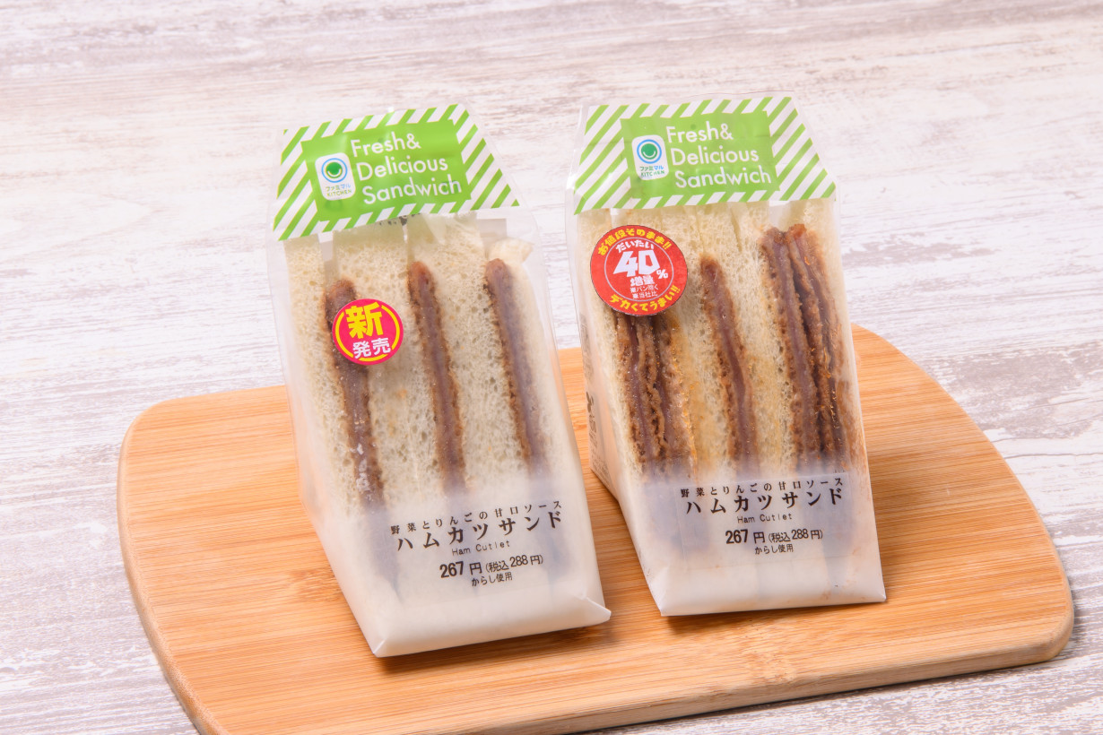 また、「増量 ハムカツサンド」もおすすめです。「だいたい40%増量作戦」対象商品。ハムカツ3層のサンドイッチです。野菜とりんごの甘口ソースとからしマヨネーズで味付け。具材のハムカツをだいたい40%増量しました。