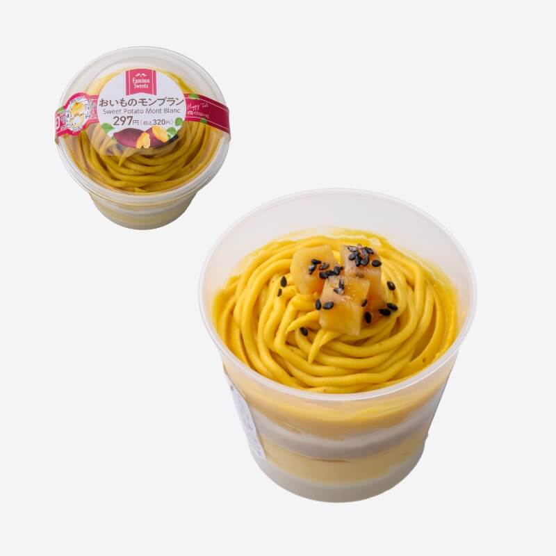 紅あずまのダイスを乗せ、紅はるかのクリームとソースにさつま芋きんとん、モンブランクリーム等を重ね、中にコーティングしたサクサク食感のメレンゲをいれたおいものモンブランです。