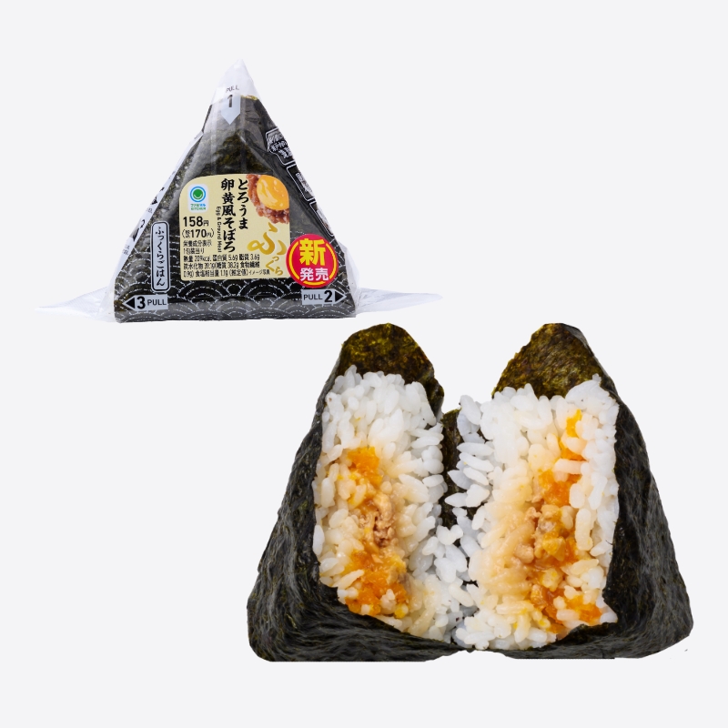 専門店のようなふっくらとしたおむすびです。醤油だれと合わせた卵黄ソースと、甘辛く味付けした鶏豚のミンチ肉を包みました。