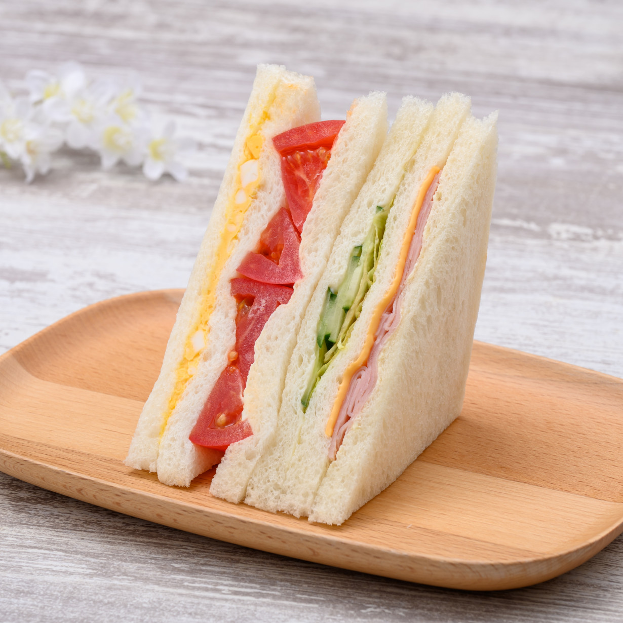 今回のおすすめは、「トマトとハムのミックスサンド」です。トマト&たまごと、ハムチーズ野菜の2つの味わいが楽しめるサンドイッチです。