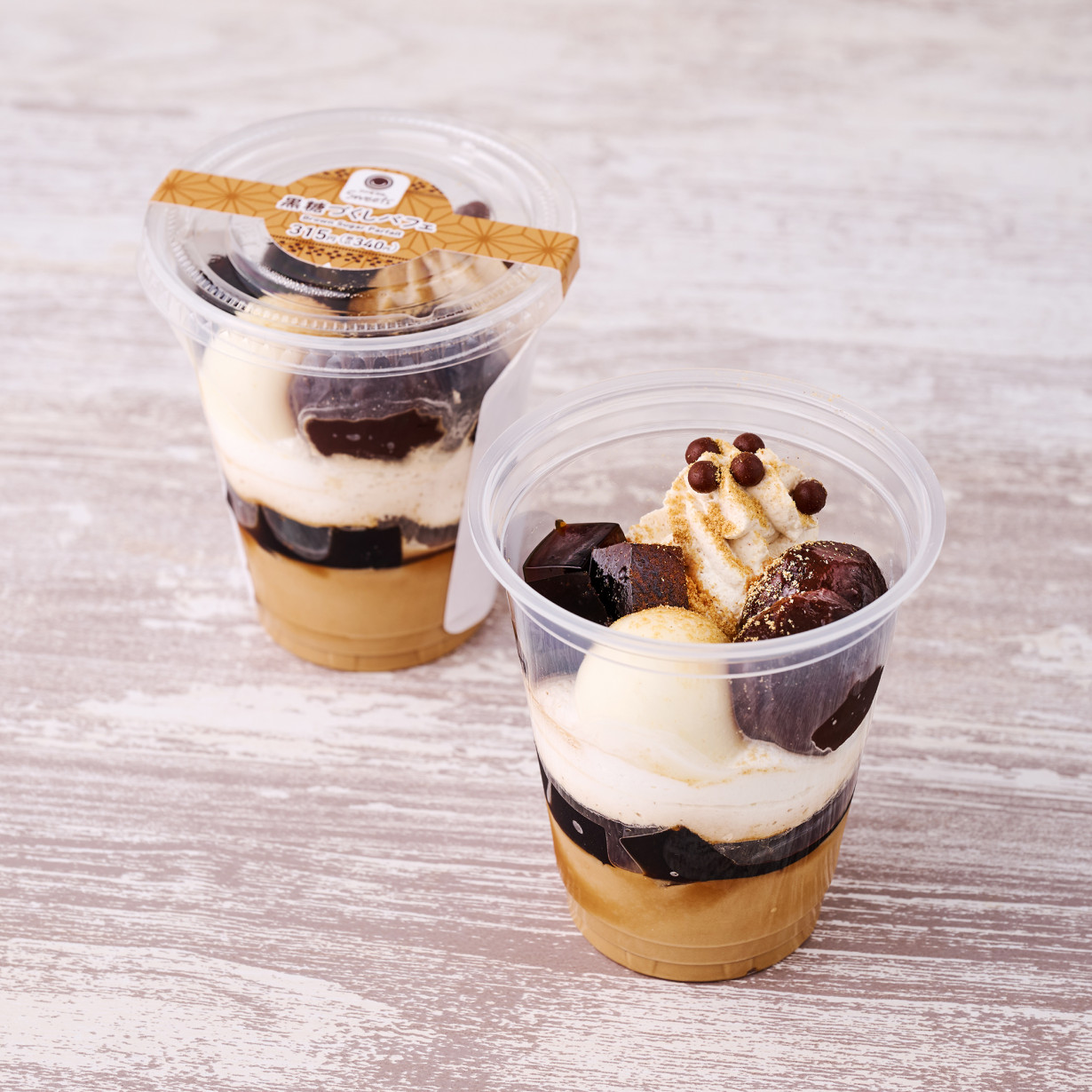 黒糖ムースに黒糖ゼリーをかさね、ホイップクリーム、黒糖きな粉ホイップクリームを絞りました。チョコ黒糖わらび餅をトッピングした黒糖の味わいが楽しめます。