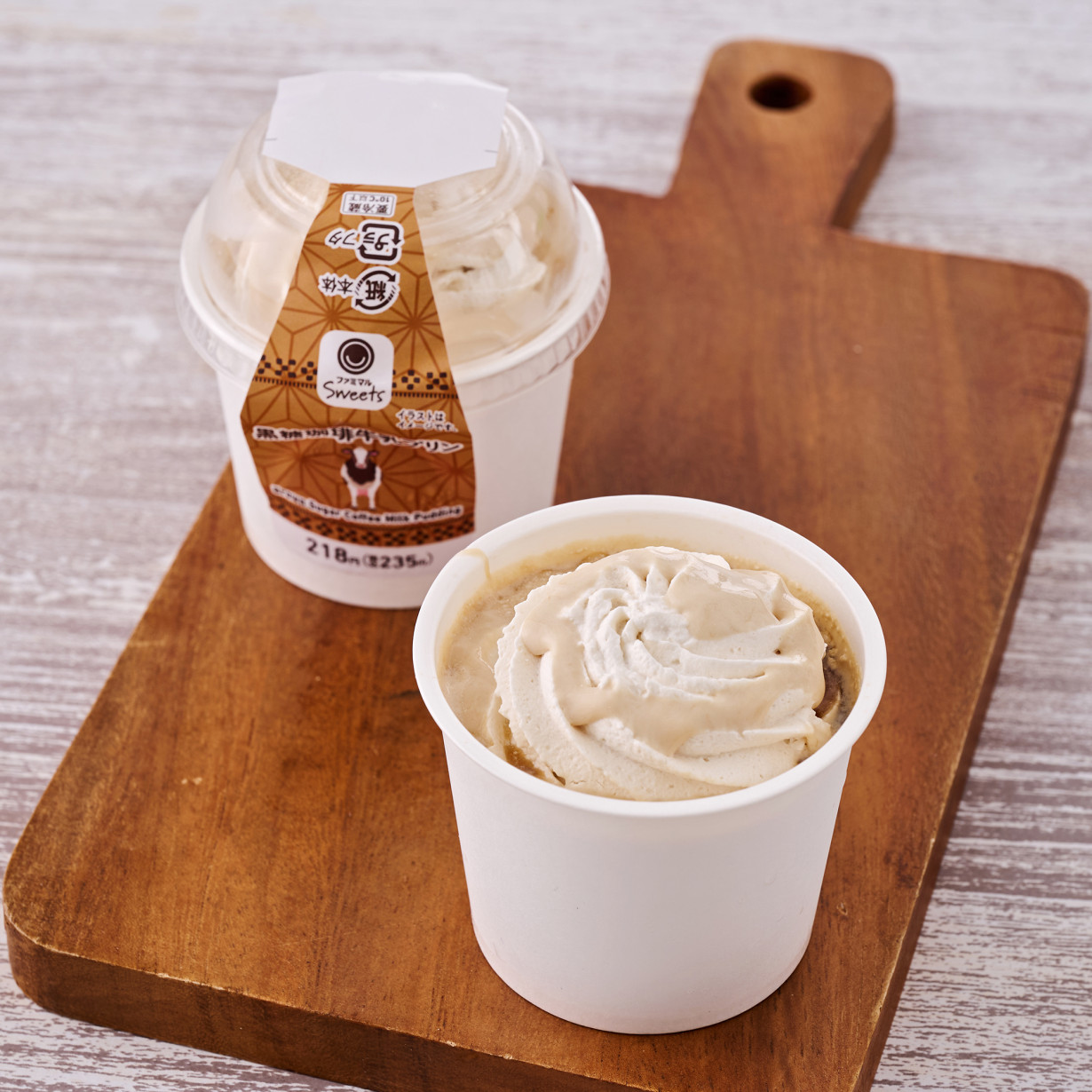 黒糖のやさしい甘さの珈琲牛乳プリン。黒糖を加えた生乳入りホイップクリームと牛乳ソースを絞り仕上げました。