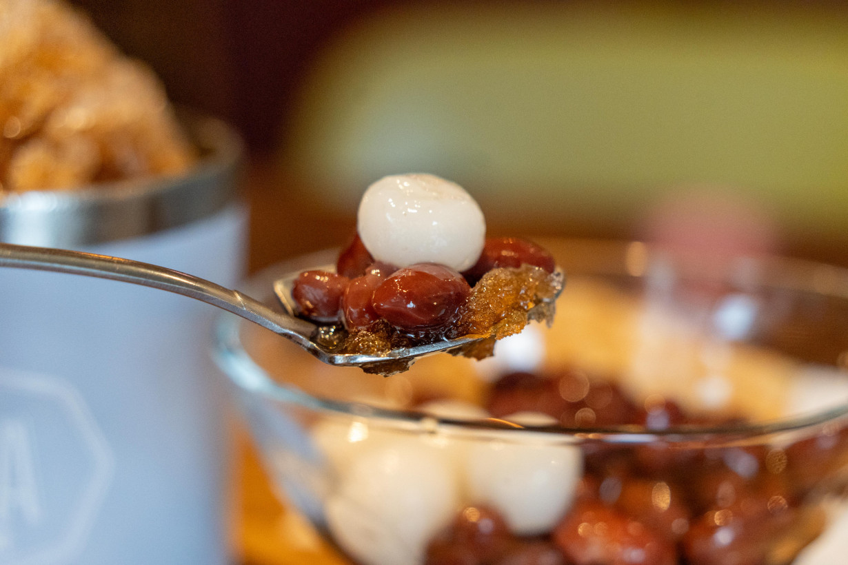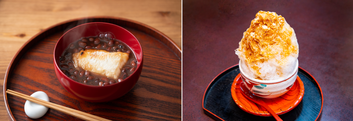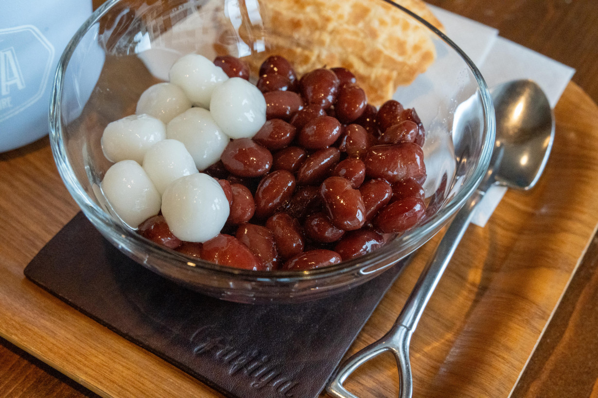 じっくり煮込んだ金時豆ともちもちの白玉。さらに、煮汁で作ったシャリシャリの氷がやさしい甘さを引き立て、最後のひと口まで飽きずに楽しめる仕上がりです。