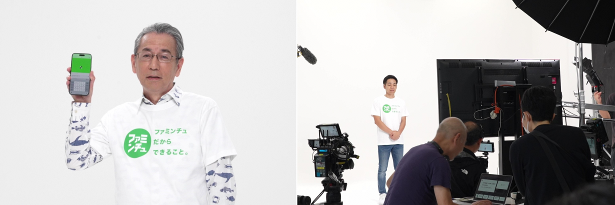 真っ白なバックスクリーン、シンプルな白地のTシャツに「ファミンチュ」のロゴがよく映えています。