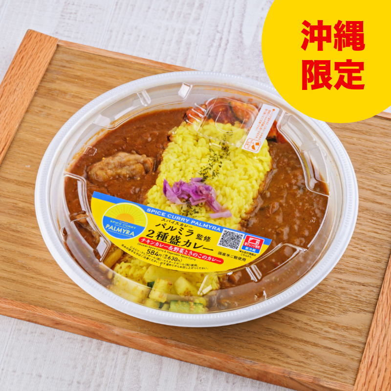 スパイスカレーパルミラ監修商品。スパイスの効いたチキンカレー・キノコと豆のカレーの2種類のカレーが楽しめる仕立てです。付け合わせにもこだわったスパイスカレーです。