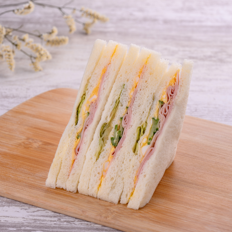ハム・きゅうり・レタス・たまごサラダの具材を組み合わせたサンドイッチを、お値段そのまま1個増量し「たぶん40%増量」しています。玉ねぎやピクルスを使用したタルタルソースがアクセントになっています。