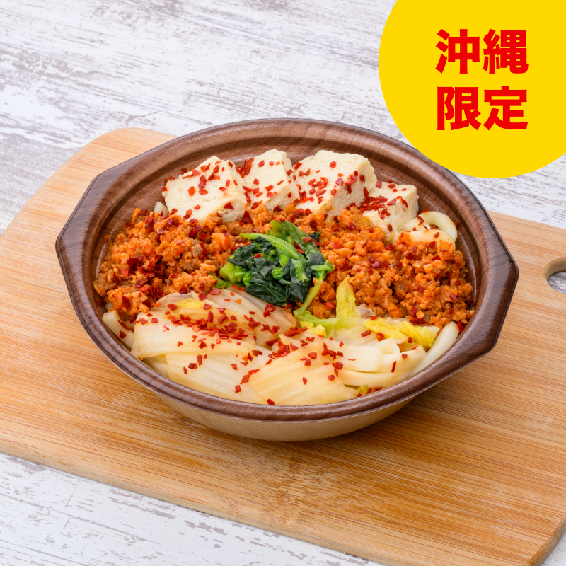 うどん、白菜、島豆腐、肉味噌、ほうれん草の具材を使用。牛とあさりのうまみが効いたチゲ風スープです。
