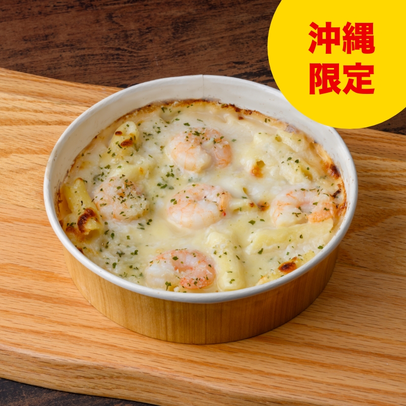 自社内製ベシャメルソースを使用した海老グラタン。ベシャメルソースには海老の調理工程時に出るエキスを使用することで、全体に海老の旨味が感じられる仕立てにしました。