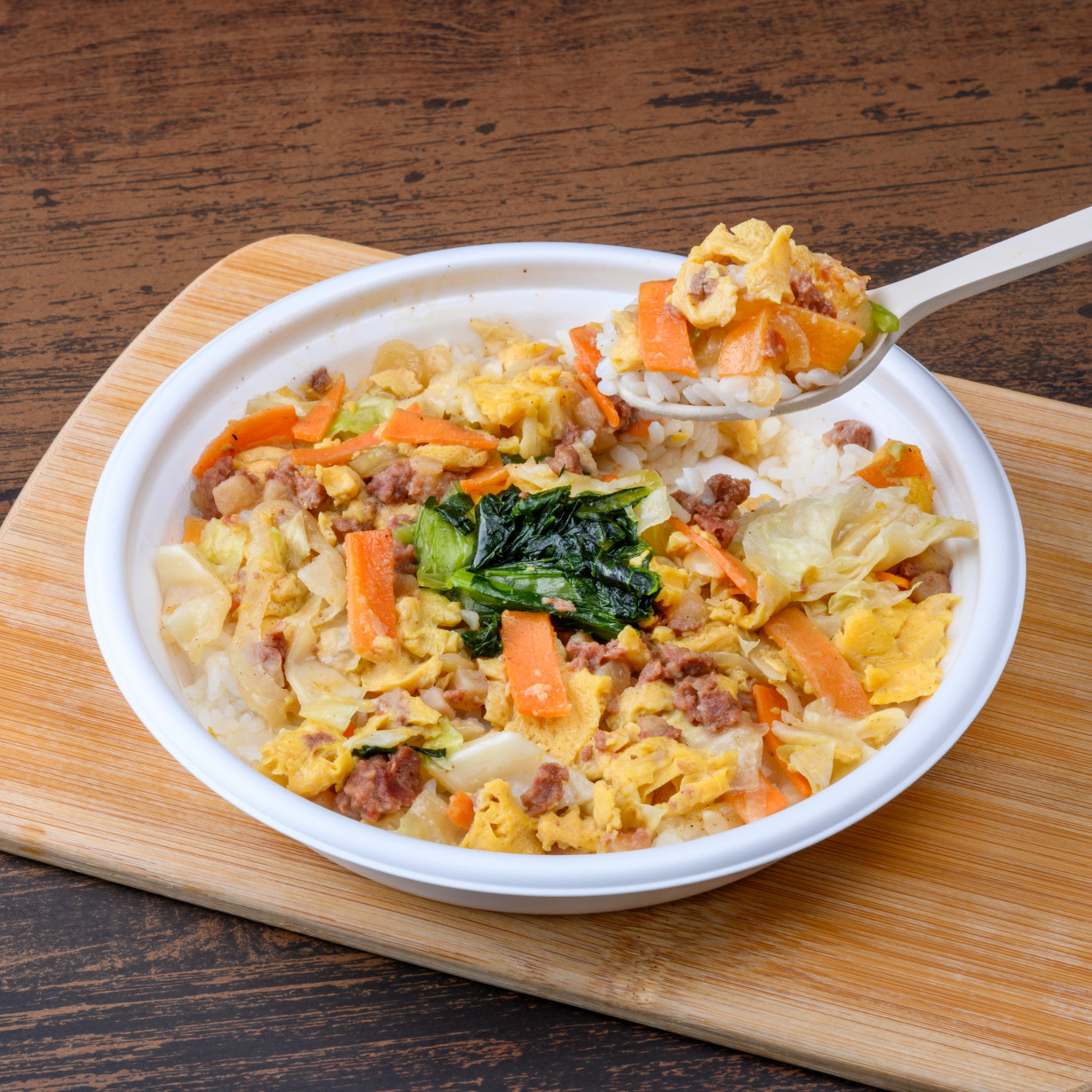 3種類のかつおだしを使用し、かつおの旨味・風味を感じられるだしと野菜を玉子でとじて仕上げました。