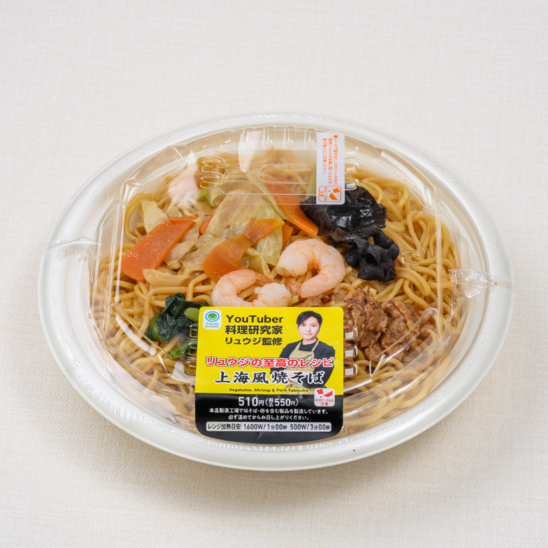 醤油とオイスターソースをベースにラー油とにんにくをアクセントに加えた上海風焼そばで、海老、豚肉炒め、野菜炒め、小松菜、きくらげをトッピングしました。